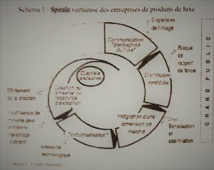 One representation of the start-up critical path is given by the “Spirale Vertueuse” which is a legacy from Crédit national, in 1992, at a time when this institution wanted to describe challenges and pitfalls ahead of start-ups storys in the luxury goods industry, from design to manufacturing, from manufacturing to branding, from branding to distribution, from distribution to consumer, and back again to design. This “Spirale Vertueuse” (“Rapport sur les industries du Luxe”) has been celebrated as self explanatory by the Conseil Economique et Social et Environnemental (“Le luxe, production et services“, February 13th, 2008 please see picture below).